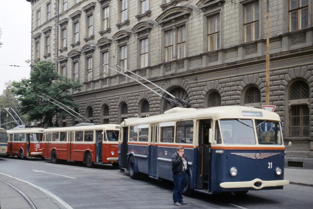 Odstavené historické trolejbusy v ústí Benešovy ulice na Malinovského náměstí. Trolejové vedení v tomto úseku bylo vybudováno v roce 1982 v souvislosti s přestavbou smyčky u hlavního nádraží (trolejbusy linek 131, 133 a 141 pak byly ukončeny velkou "smyčkou" Koliště > Malin. nám. > Benešova). V roce 1985 byl obnoven provoz na dnešní konečnou u hlavního nádraží, trolejové vedení v Benešově ulici bylo později sneseno.