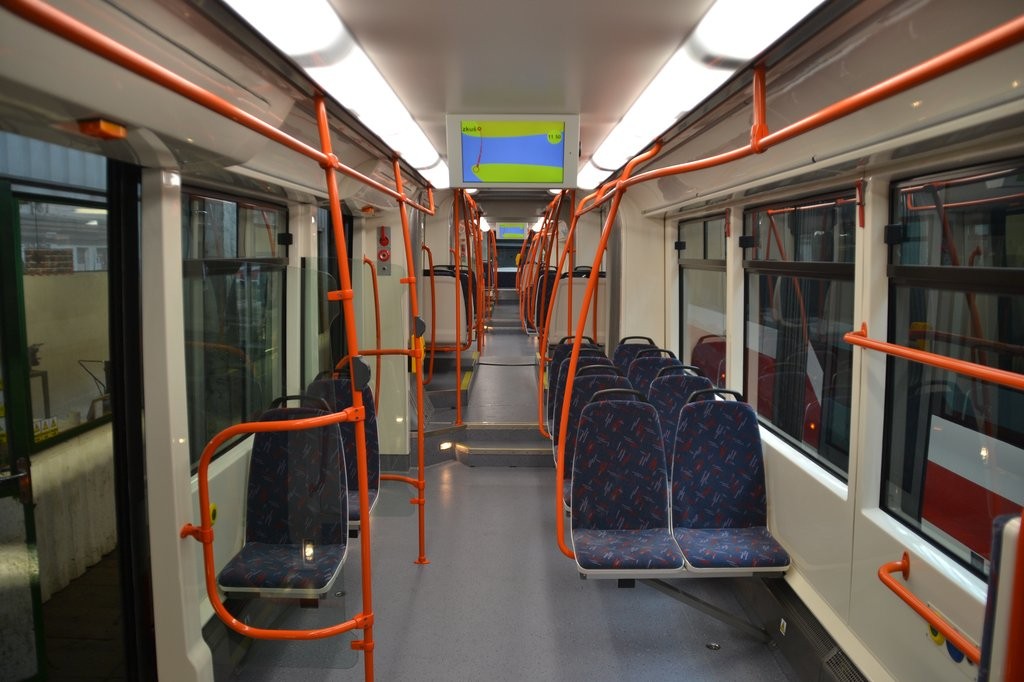 Interiér vozu 13T6. Proti starším sériím na fotografii patrné rozdíly: dva přechodové schody mezi články místo jednoho, posuvná okna místo výklopných a potahy sedadel v současně užívaném vzoru
