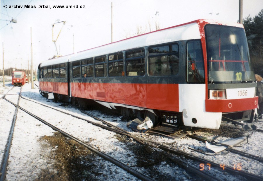 poškozený a vykolejený vůz K2R 1066 po střetu s KT8D5 1708