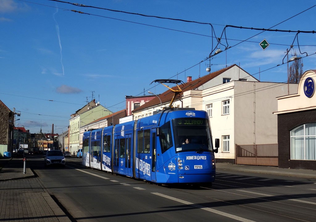 13T4 ev. č. 1916 s celovozovou reklamou propagující hokejový klub HC Kometa Brno.