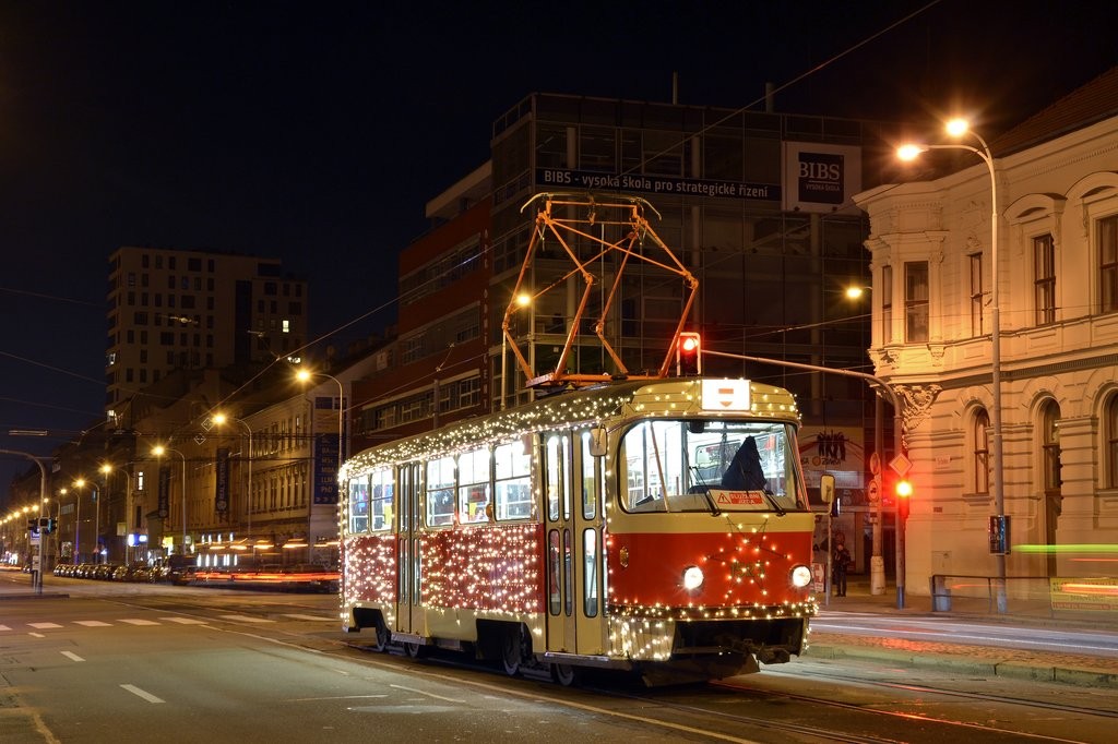 Vánoční tramvaj DPMB při večerním zátahu do vozovny Medlánky.