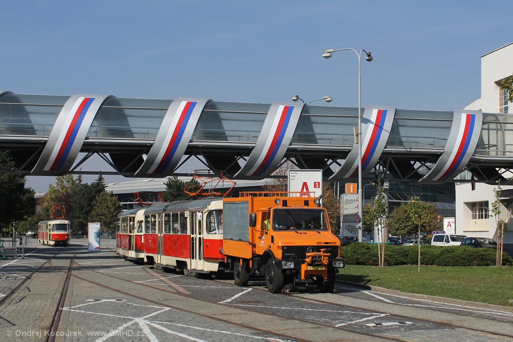 Fotografie Mercedes-Benz Unimog U 1250 Zweiweg 5297 (BSC 52-62) DPMB | ČKD Tatra T3 1525 DPMB | Tatra T2 1435 DPMB | Brno-Pisárky, Výstaviště BVV | Fotogalerie BMHD