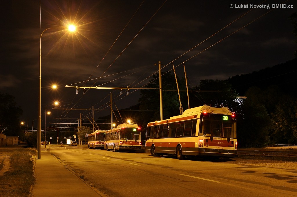 Odstavené posilové trolejbusy čekají na odvoz diváků z ohňostroje konaného na Brněnské přehradě
