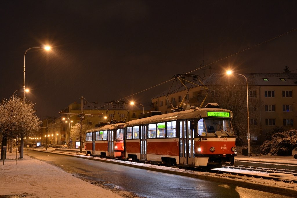 Souprava T3G 1604+1619 při plužení tramvajové trati při velkém spadu sněhu