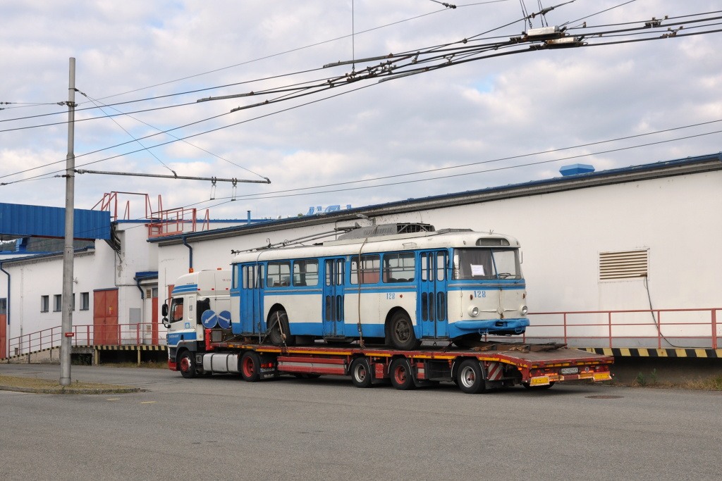 původně brněnský trolejbus Škoda 9Tr odkoupený z ukrajinského Rovna do sbírky retro vozů při příjezdu do areálu vozovny Komín