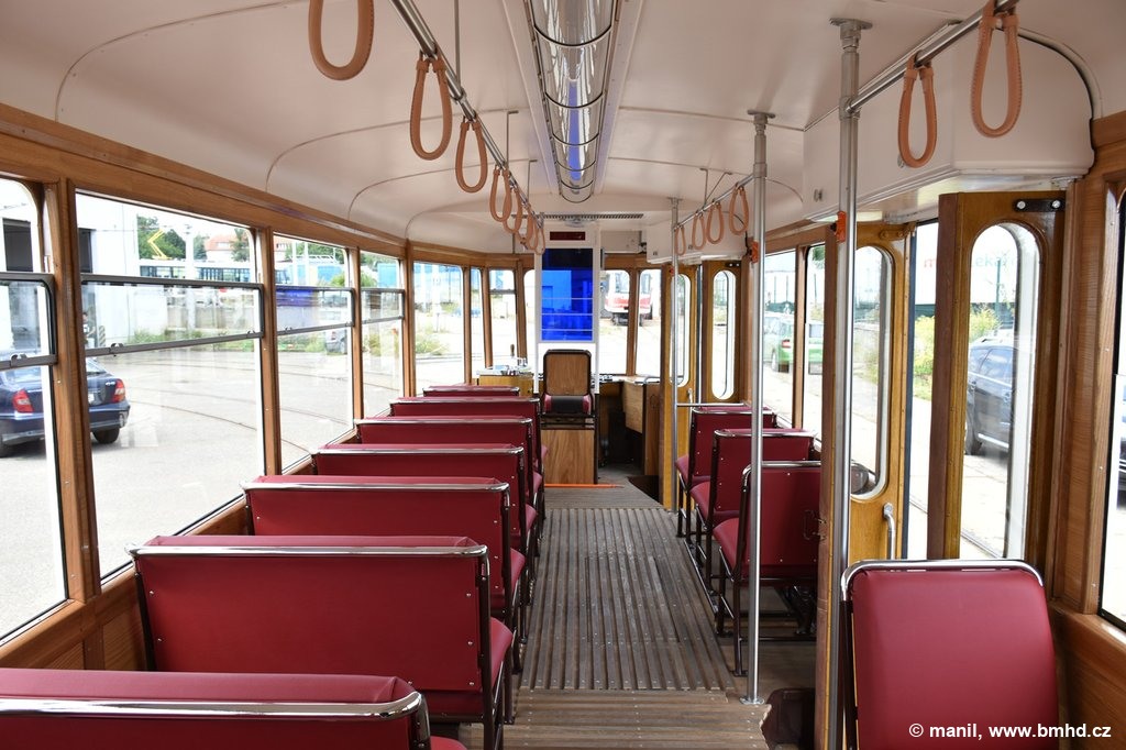 Interiér historické tramvaje 4MT ev. č. 134 po renovaci.