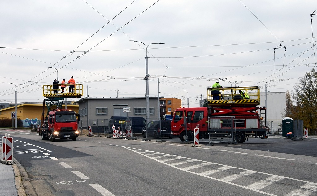 Dokončovací práce na trolejovém vedení v oblasti zastávek Jírova.