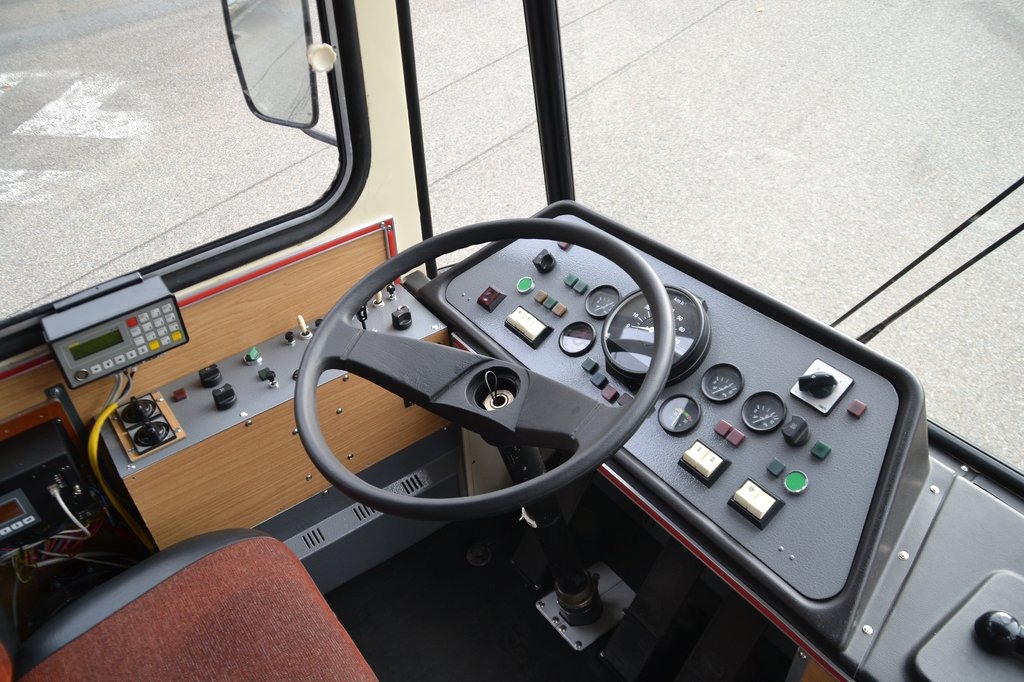 Palubní deska retro trolejbusu 15Tr 3502, zde na fotografii ještě s nepůvodním volantem.