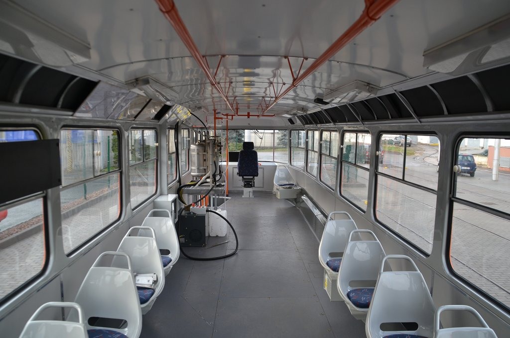 Interiér služební tramvaje T3M ev. č. 1544. V zadní části vozu je patrná technologie k ovládání mazacího pantografu s kompresorem a nádobou na stlačený vzduch a glycerinovou nemrznoucí směs. Rozšířený zadní pojezd je doplněn o sedadlo řidiče.