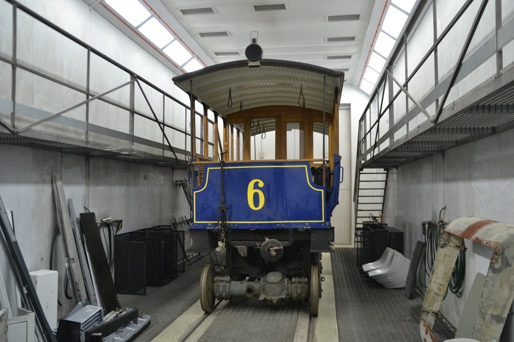 Vlečný vůz koňky při opravě uložení náprav a brzdového systému v Ústředních dílnách DPMB.