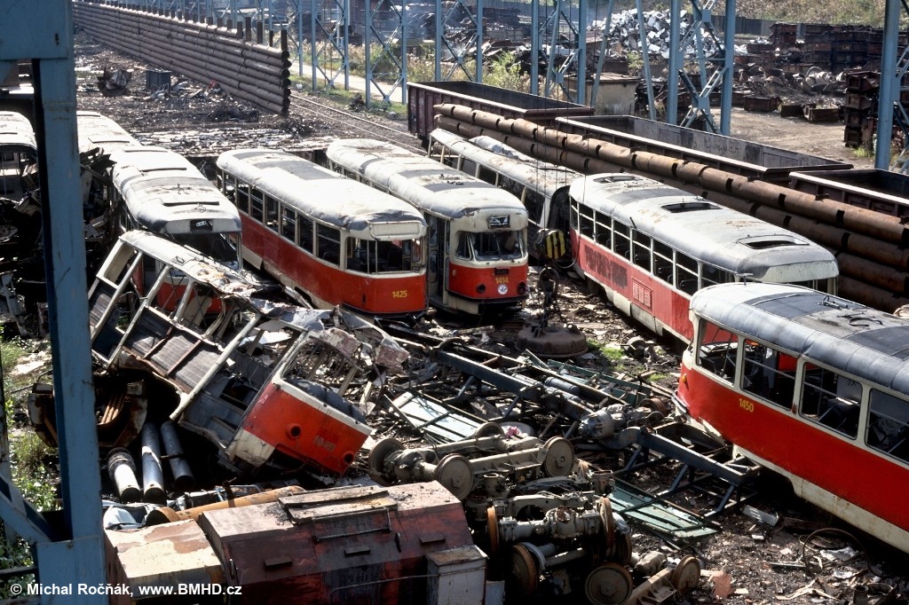 Fotografie Tatra T2 1425 DPMB | Tatra T2 1414 DPMB | Tatra T2 1450 DPMB | ČKD Tatra K2 1045 DPMB | Brno-Horní Heršpice, Kšírova, kovošrot | Fotogalerie BMHD