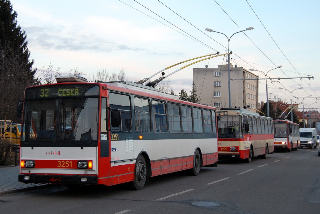 Fotografie Škoda 14 Tr08/6 3214 DPMB | Škoda 14 Tr07 3199 DPMB | Škoda 14 TrR 3251 DPMB | Brno-Královo Pole, Srbská | Fotogalerie BMHD
