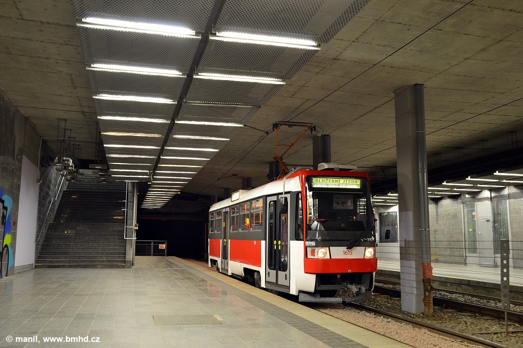 Podzemní stanice Líšeň, Jírova. Vjezd jednosměrných vozů bývá umožněn v rámci výlepu zastávkových JŘ na samostatných tělesech při hromadných změnách JŘ, kdy se z důvodu špatné dostupnosti zastávek na segregovaných tratích servisním automobilem využívá tramvaj.
