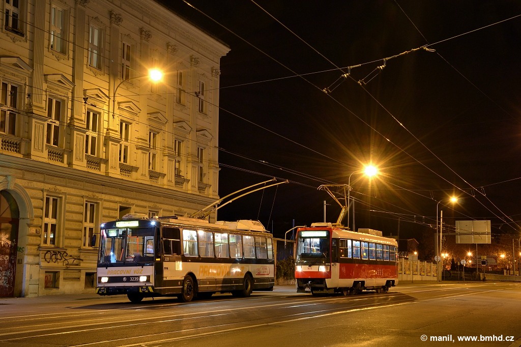 Setkání protinámrazového trolejbusu 14Tr s vozem T3R č. 1615, který byl vypraven jako servisní tramvaj pro výlep zastávkových JŘ na samostatných tělesech.