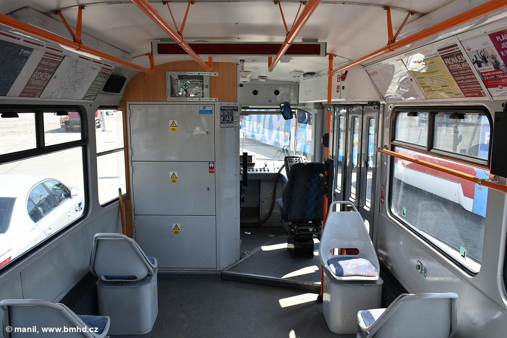 Interiér cvičné tramvaje T3R.PV 1658 s částečně rozebíratelnou zástěnou kabinou pro doplnění sedadla a ovládacího panelu pro instruktora