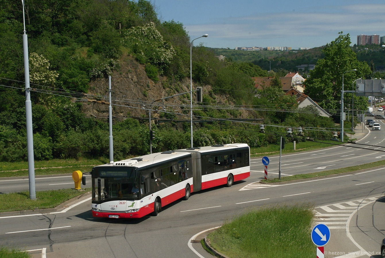 Autobus na lince 44 zachycený při odbočování kongescemi zužovaným Tomkovým náměstí do ulice Provazníkovy. Domy v pravé části snímku jsou již v době uveřejnění snímku minulostí, byly tottiž srovnány se zemí, kvůli stavbě plánované mimoúrovňové křižovatky. V levé části snímku je patrná stráň Husovického kopce, kde se také nachází bunkr a kryt CO. V obdobné skále ústí i silnice I/42 do Husovického tunelu, a alespoň část zejména tranzitní dopravy se snaží odvést za hranice města. Pokud však tunel není uzavřen, v tom případě je veškerá doprava odkloněna ve směru jízdy Solarisu na snímku a to ulicí Provazníkovou a poté Merhautovou. Takovéto uzavírky jsou však méně časté a probíhají převážně v nočních hodinách, zejména za účelem mytí a pravidelné údržby tunelu. A stejně jako autobus linky 44 toho dne však VMO neopouští naposled, v ulici Křižíkově se totiž provdí oprava povrchu vozovky a proto jezdí linka 44 po VMO ulicí Porgesovou.