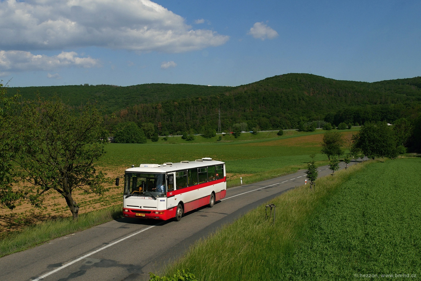 Linka 52 má ve svých některých částech opravdu vesnický charakter, jako třeba tady u zastávky Kopce. V pozadí lze na horizontu spatřit vyčnívající vrcholky paneláků kohoutovického sídliště, odkud Karosa mimojiné směřuje. Nejvyšší bod na snímku je bezejmenná kóta o výšce až 395 m.n.m.