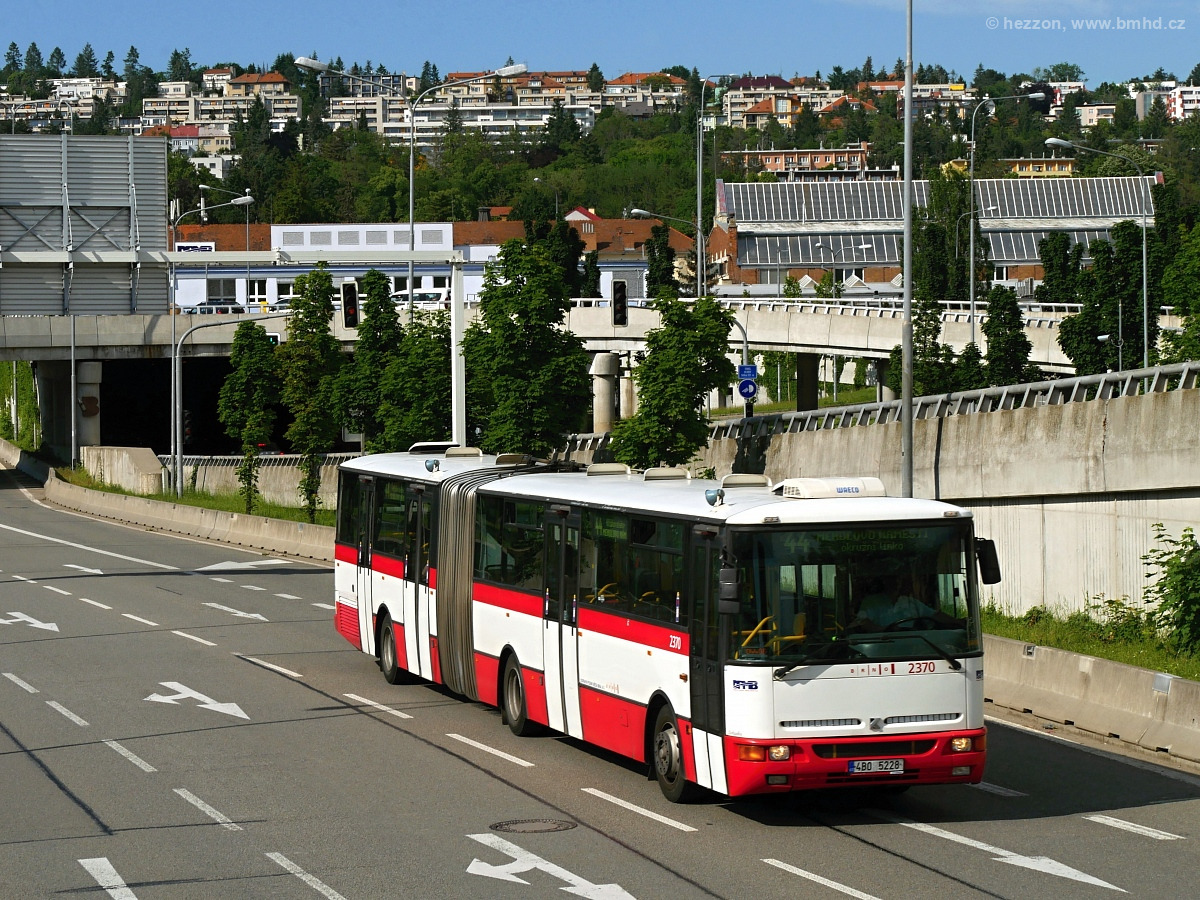 Vůz 2370 se proplítá složitou spleticí připojovacích a odbočovacích pruhů křižovatky Hlinky, která byla dokončena v roce 2007. Na pozadí se nachází zděné budovy Pisárecké vozovny a ve stráni je zbylá část brněnských Pisárek, blíže si lze architektonická díla prohlédnout například z okna trolejbusu linky 38, která je sem do této kopcovité části města po ulici Preslově zavedena.
