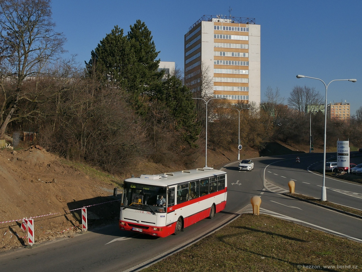 Expresní linka E56 je charakteristická využíváním rychlostních komunikací po městě, jako i zde při svých posledních kilometrech na této lince, najíždí Karosa na přivaděč čtyřproudé ulice Hradecké. Jako na jedné z mála linek zde není na obtíž i negarantovaný spoj, díky skladbě cestujících kteří jsou ve většině případů dostatečně mobilní, a to zejména studenti a běžně pracující. Panelový dům na Hudcově 76 na pozadí nese název "Dům Jiřího Gruši" což byl básník a prozaik a proto není divu, že zde sídlí Moravské zemské muzeum se svým Centrem dějin literatury a několika dalšími depozitáři. Po objednání je možné objekt dokonce i navštívit.