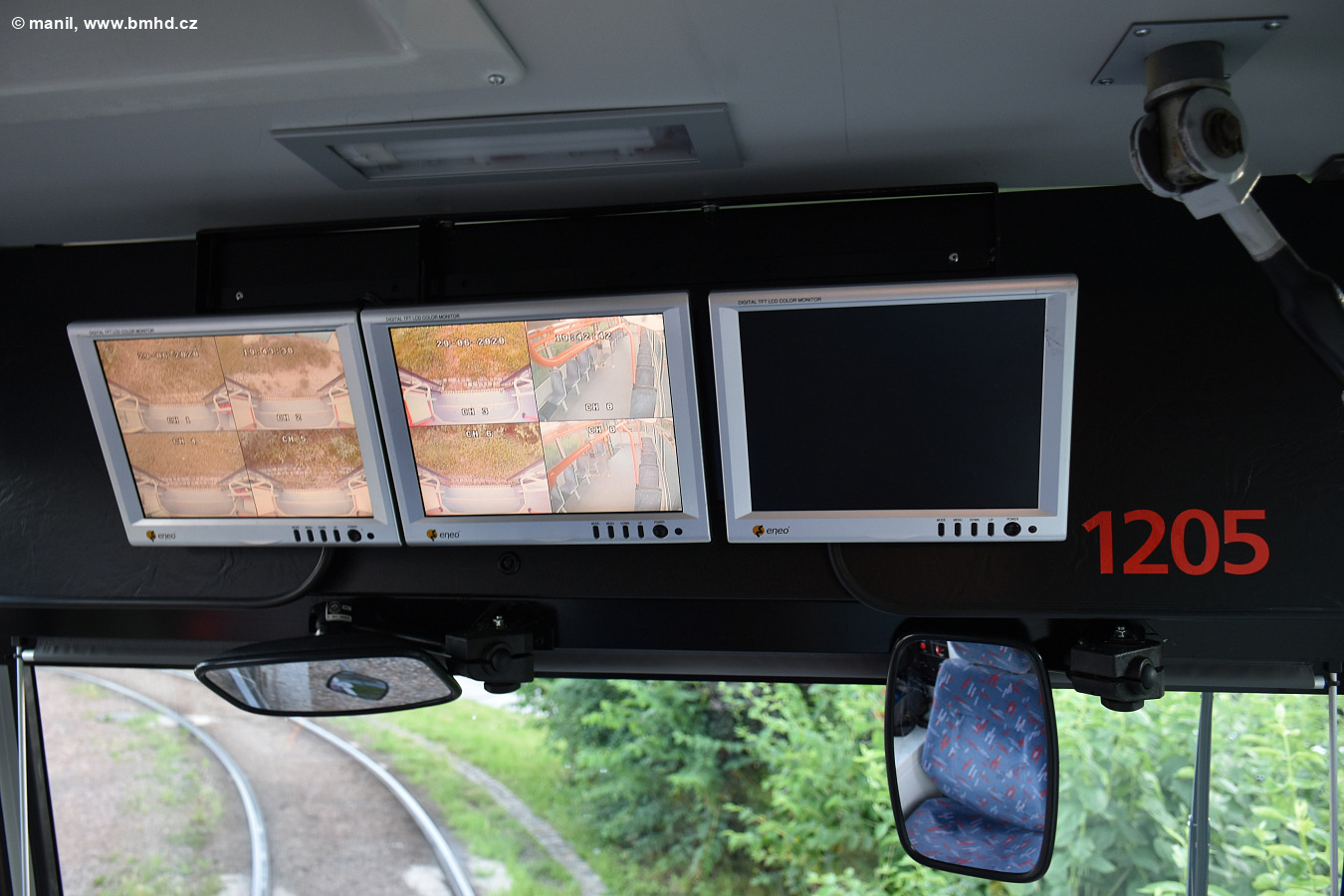 Monitory v kabině tramvaje T6A5 pro sledování dveřních prostorů a salónů. Třetí monitor je připraven pro provoz ve trojčeti.