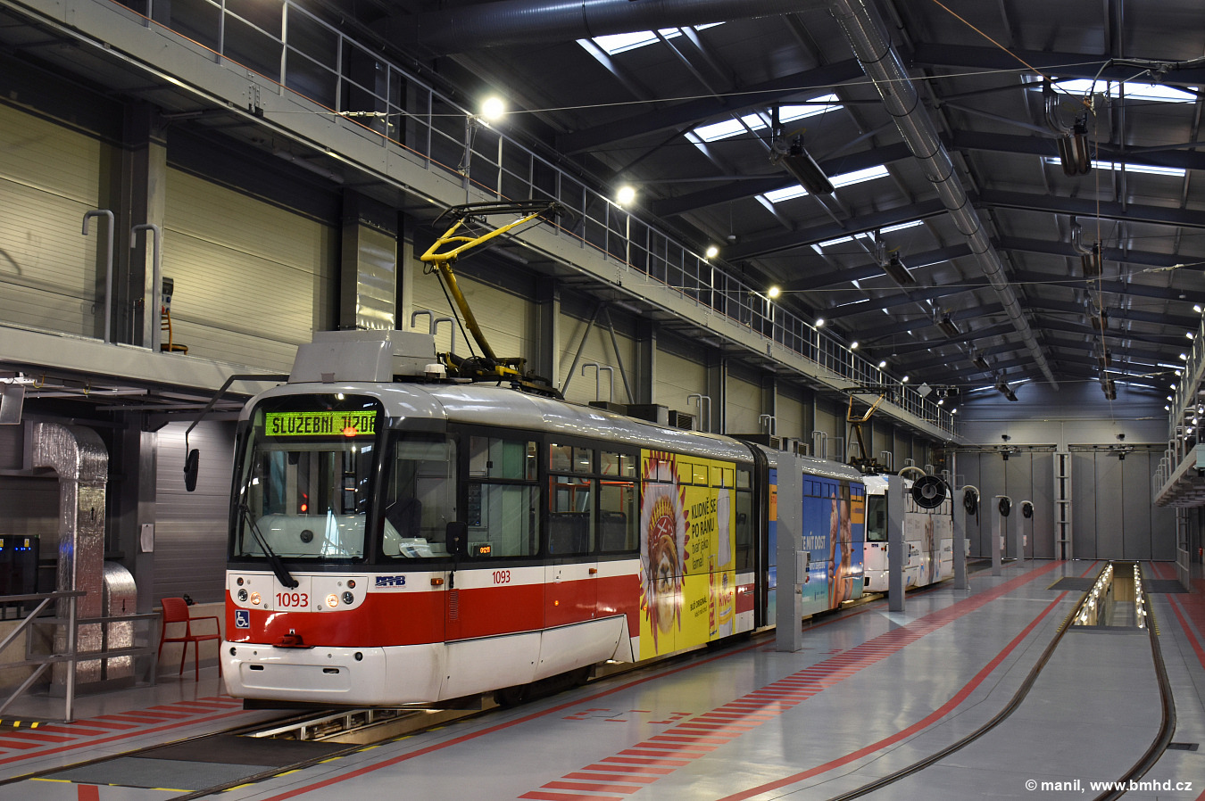 Souprava VarioLF2+LF1 1093+1582 při denním ošetření ve vozovně Pisárky