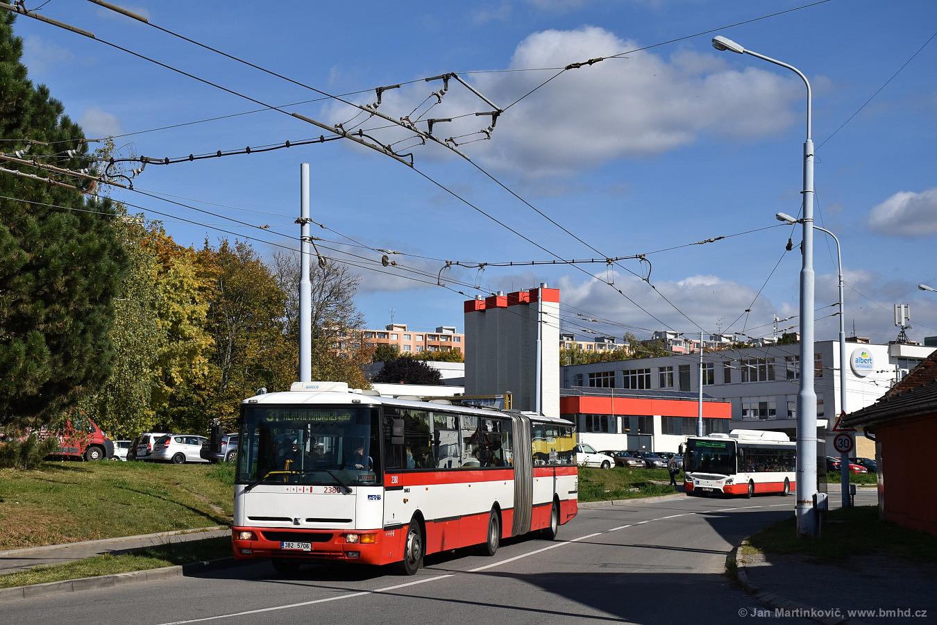 Z důvodu opravy komunikace mezi Slatinou a Šlapanicemi byla linka 31 odkloněna přes Bedřichovice - Slatina, sídliště - Vlárská. Na fotografii lze vidět vůz Karosa B961E.1970 ev.č. 2380, který byl jako jeden z několika dalších vysokopodlažních vozů mimořádně vypraven i o víkendu na garantované nízkopodlažní spoje.