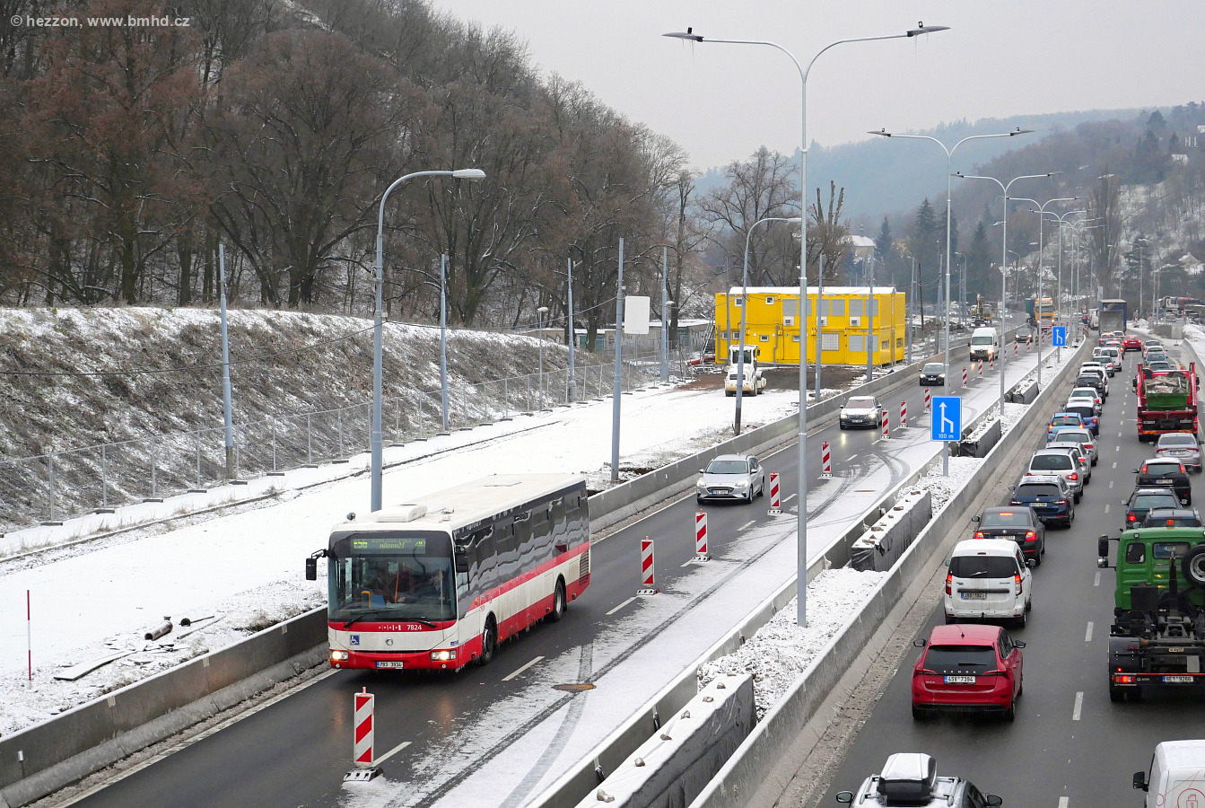 Snímek zachycující jedno z úzkých hrdel brněnského městského okruhu. V pracovních dnech tak linka E56 běžně nabírá zpoždění 10-15 minut. V pozadí snímku se nachází zázemí stavby, odkud bude dále tramvaj pokračovat tunelem směr Pisárky a díky tomu uvolní prostor pro dostavbu VMO na čtyři proudy.
