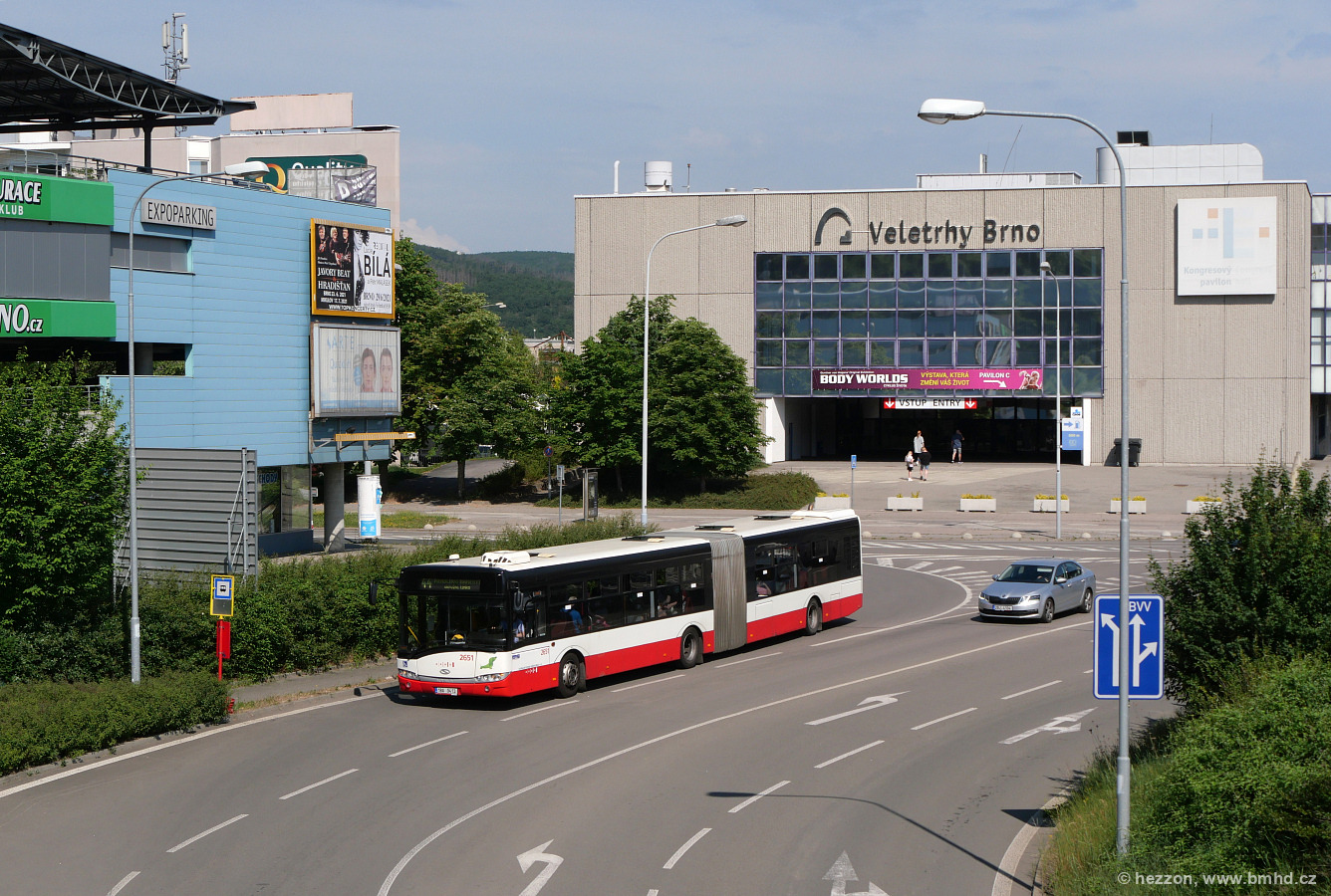 V poměrně netradičním směru projížděla linka 44 kolem brněnského výstaviště a to z důvodu rekonstrukce vodovodu a kanalizace na Křížkovského ulici. Zastávka Velodrom byla přeložena a od zmíněné zastávky na snímku linka 44 dále pokračovala na zastávku Poříčí. Na pozadí u vstupu do kongresového pavilonu poutač zve na jednu z mála akcí během pandemie, která se na výstavišti odehrála a to výstava plastinovaných zakonzervovaných těl Body Worlds.
