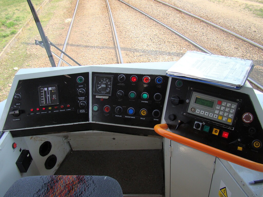 palubní deska T3R po VP. Původní obrazovka CAN diagnostiky byla nahrazena světelným A/V metrem a jednoduchou diodkovou signalizací poruch