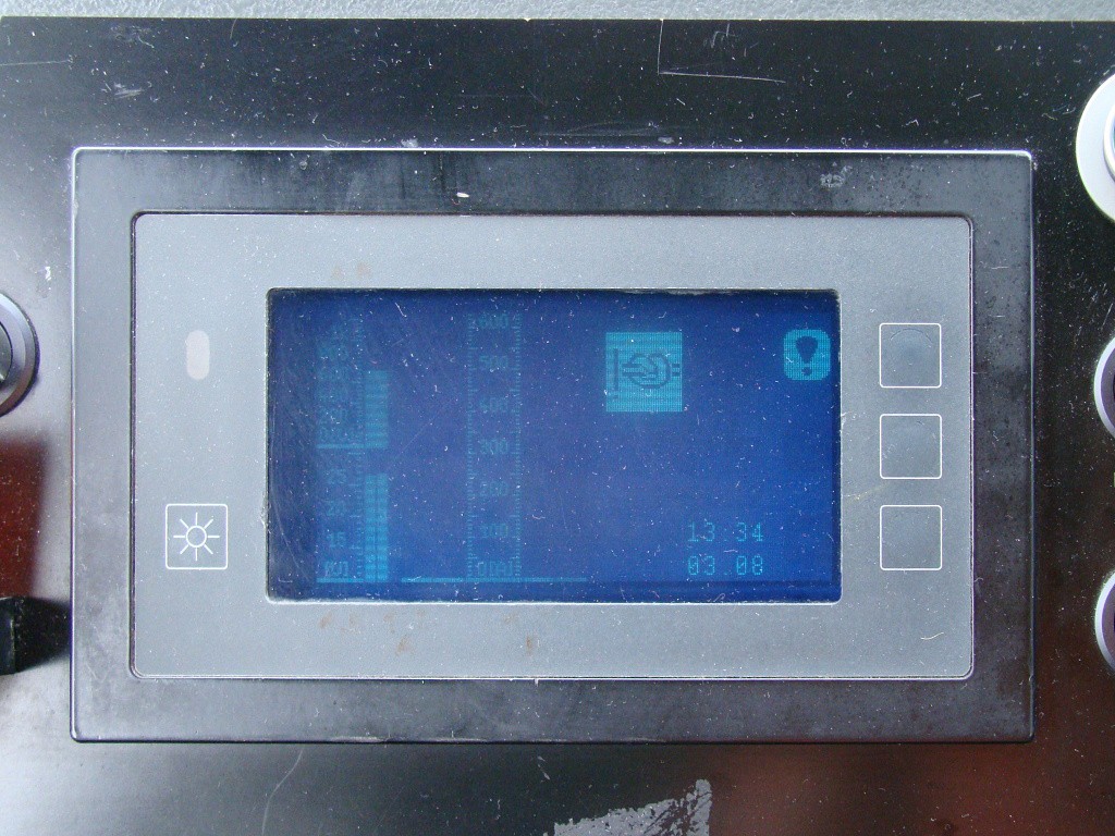 obrazovka CAN diagnostiky. V levém spodním rohu je voltmetr napětí vozové baterie, vlevo nahoře voltmetr napětí sítě, uprostřed je Ampermetr jízdy/brzdy, v pravo dole datum a čas. Piktogramy ve volném prostoru značí poruchy. Tento piktogram znamená poruchu komunikace sběrnic CAN.