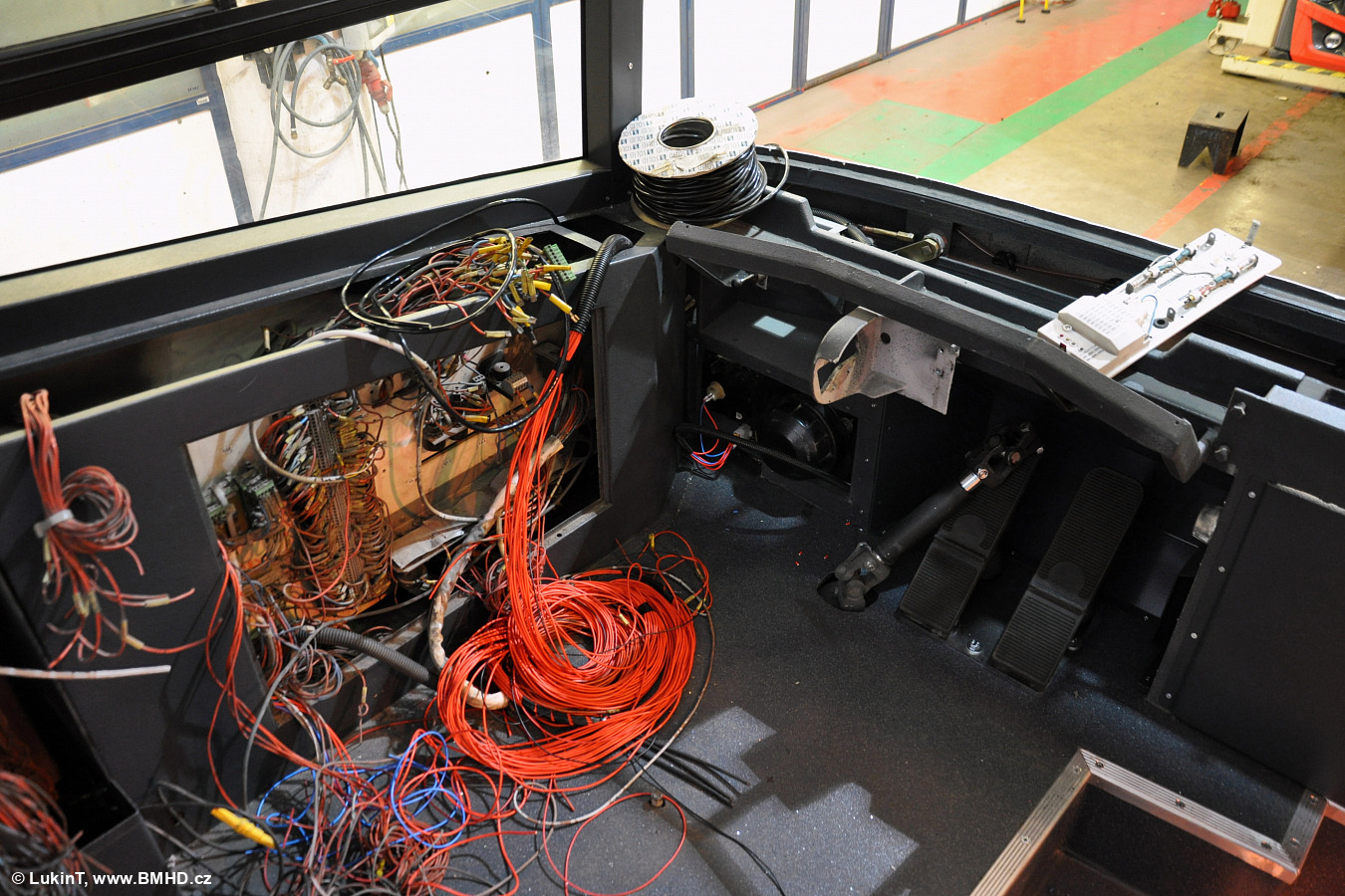 Renovace retro trolejbusu Škoda 22Tr - kabina řidiče v průběhu zapojování elektroinstalace