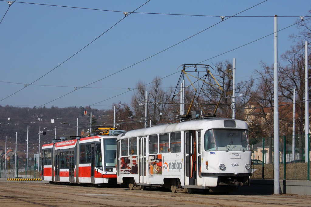 1644 čeká odstavená ve vozovně Pisárky na opravu svého A-vozu 1643 po nehodě.