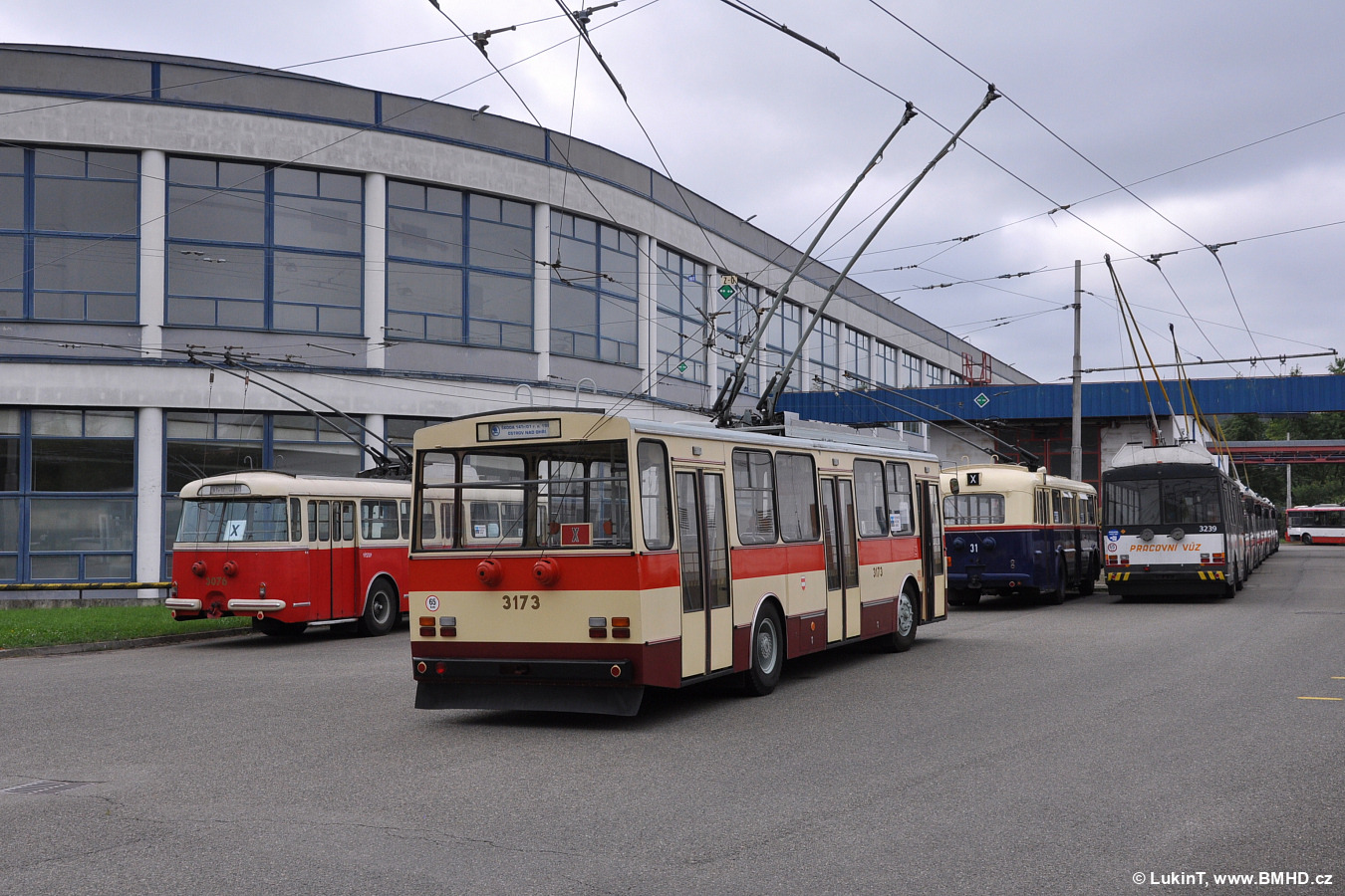 Fotografie Škoda 9 Tr17 3076 Technické muzeum v Brně | Škoda 14 Tr01 3173 Technické muzeum v Brně | Škoda 7 Tr4 31 Technické muzeum v Brně | Škoda 14 Tr10/6 3239 DPMB | Brno-Komín, vozovna Komín | Fotogalerie BMHD