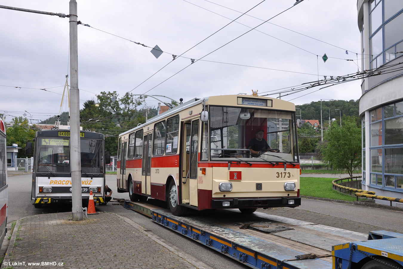 Na oslavy 75 let trolejbusové dopravy v Jihlavě byly zapůjčeny tři historické trolejbusy z Technického muzea v Brně – 7Tr, 9Tr a 14Tr. Na snímku je zvěčněn vůz 3173 během najíždění na podvalník vlastní silou.