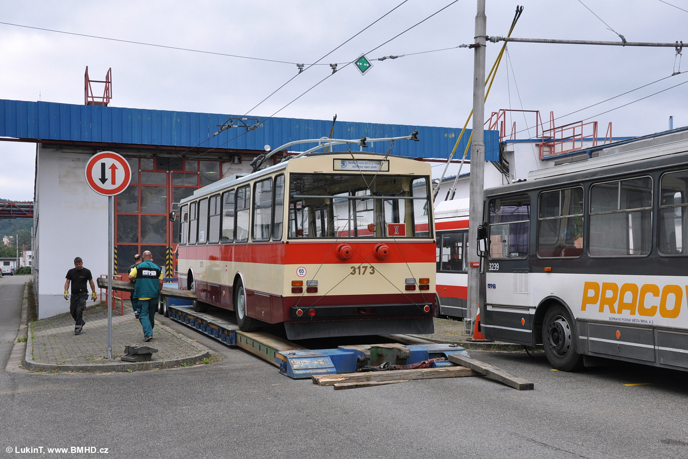Na oslavy 75 let trolejbusové dopravy v Jihlavě byly zapůjčeny tři historické trolejbusy z Technického muzea v Brně – 7Tr, 9Tr a 14Tr. Na snímku je zvěčněn vůz 3173 po najetí na podvalník vlastní silou.
