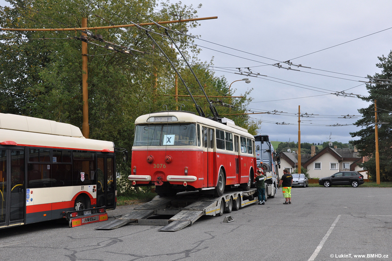 Na oslavy 75 let trolejbusové dopravy v Jihlavě byly zapůjčeny tři historické trolejbusy z Technického muzea v Brně – 7Tr, 9Tr a 14Tr. Na snímku je zvěčněn vůz 3076 během vykládky po příjezdu do Jihlavy.