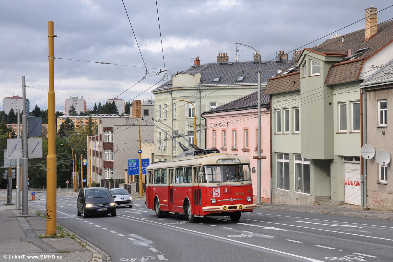Na oslavy 75 let trolejbusové dopravy v Jihlavě byly zapůjčeny tři historické trolejbusy z Technického muzea v Brně – 7Tr, 9Tr a 14Tr. Na snímku je zachycen vůz 3076 během obratu režijní jízdou z Masarykova náměstí přes kruhový objezd na Havlíčkově a zpět.