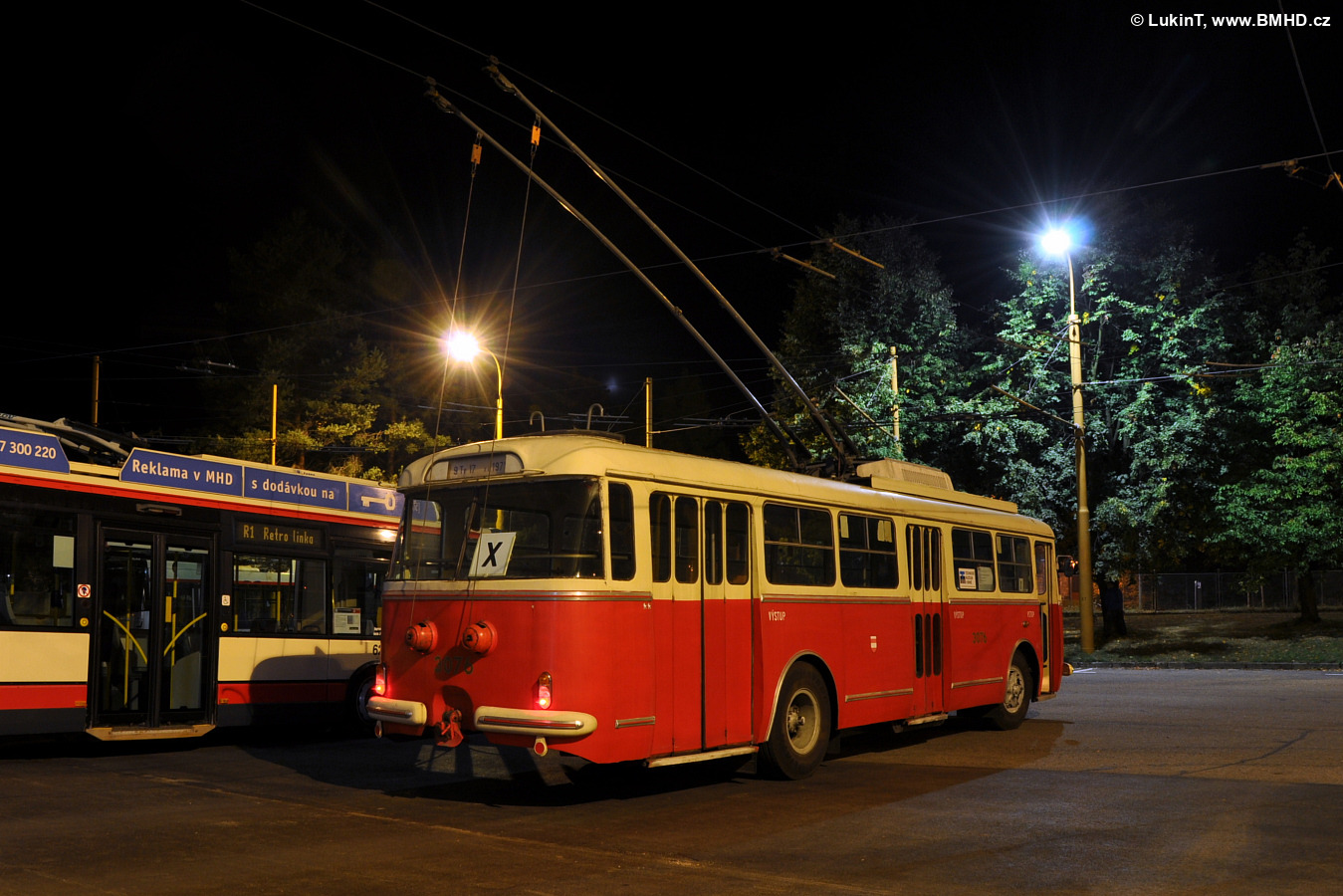 Na oslavy 75 let trolejbusové dopravy v Jihlavě byly zapůjčeny tři historické trolejbusy z Technického muzea v Brně – 7Tr, 9Tr a 14Tr. Na snímku je zvěčněn vůz 3076 před výjezdem na noční jízdu.