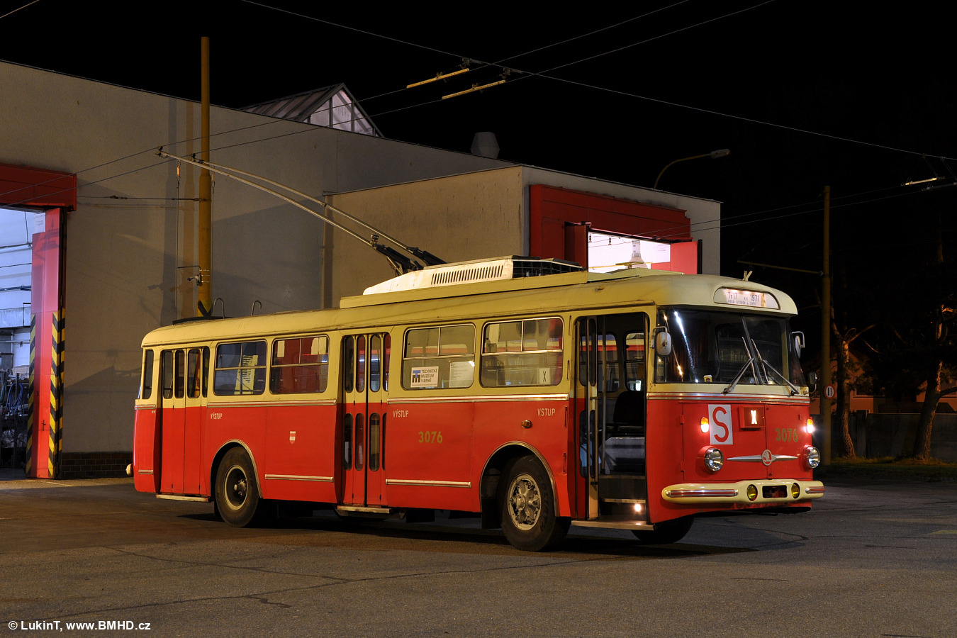 Na oslavy 75 let trolejbusové dopravy v Jihlavě byly zapůjčeny tři historické trolejbusy z Technického muzea v Brně – 7Tr, 9Tr a 14Tr. Na snímku je zvěčněn vůz 3076 před výjezdem na noční jízdu.