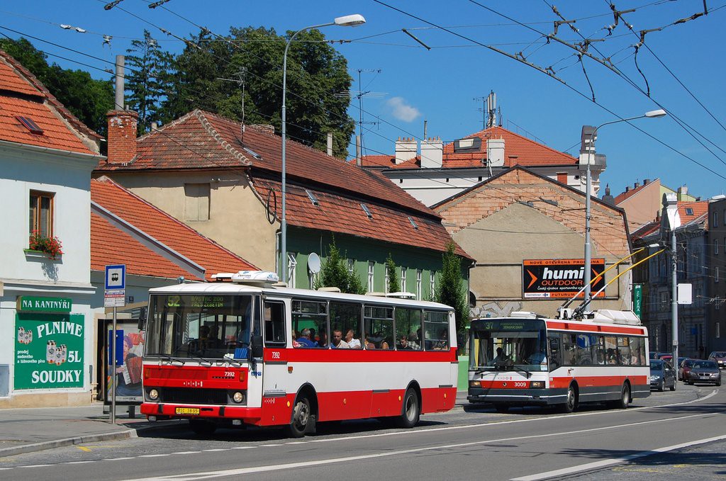 Fotografie Karosa B 732.1654.3 7392 (BSC 38-95) DPMB | Škoda 21 Tr 3009 DPMB | Brno-Pisárky, Hlinky | Fotogalerie BMHD