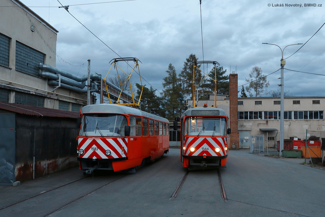 Fotografie ČKD Tatra T3P 1587 DPMB | ČKD Tatra T3M 1544 DPMB | Brno-Medlánky, Ústřední dílny | Fotogalerie BMHD