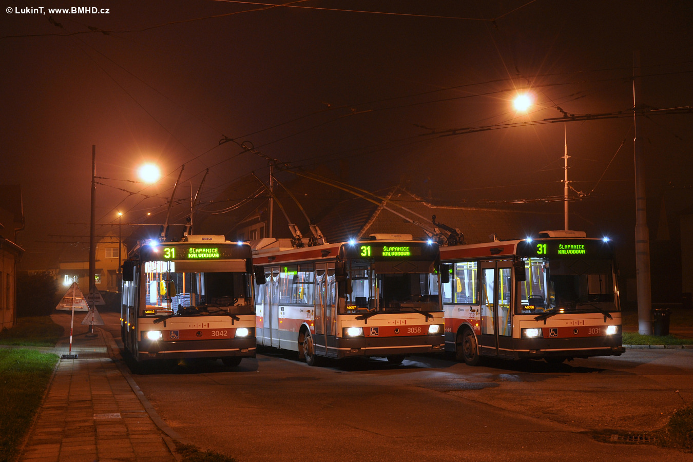 Fotografie Škoda 21 Tr 3042/II DPMB | Škoda 21 TrAC 3058/II DPMB | Škoda 21 Tr 3031/II DPMB | Šlapanice, Kalvodova | Fotogalerie BMHD