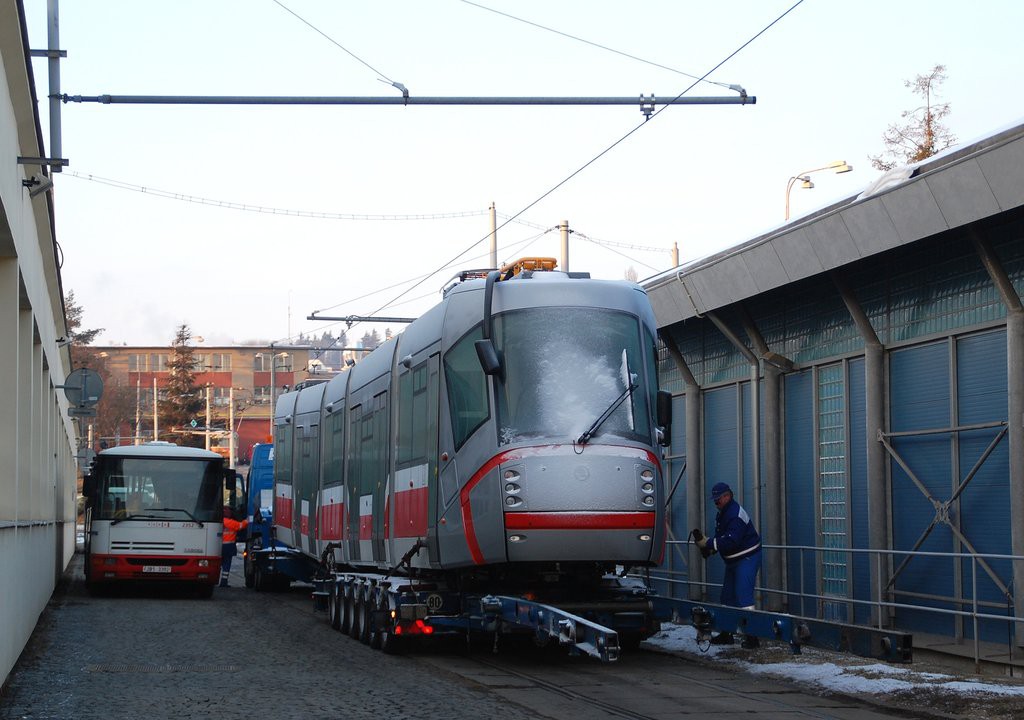 pracovníci firmy APB Plzeň připavují provizorní kolejovou rampu pro složení nové 13T 1921 ze speciálního silničního kolejového trajleru na koleje DPMB.