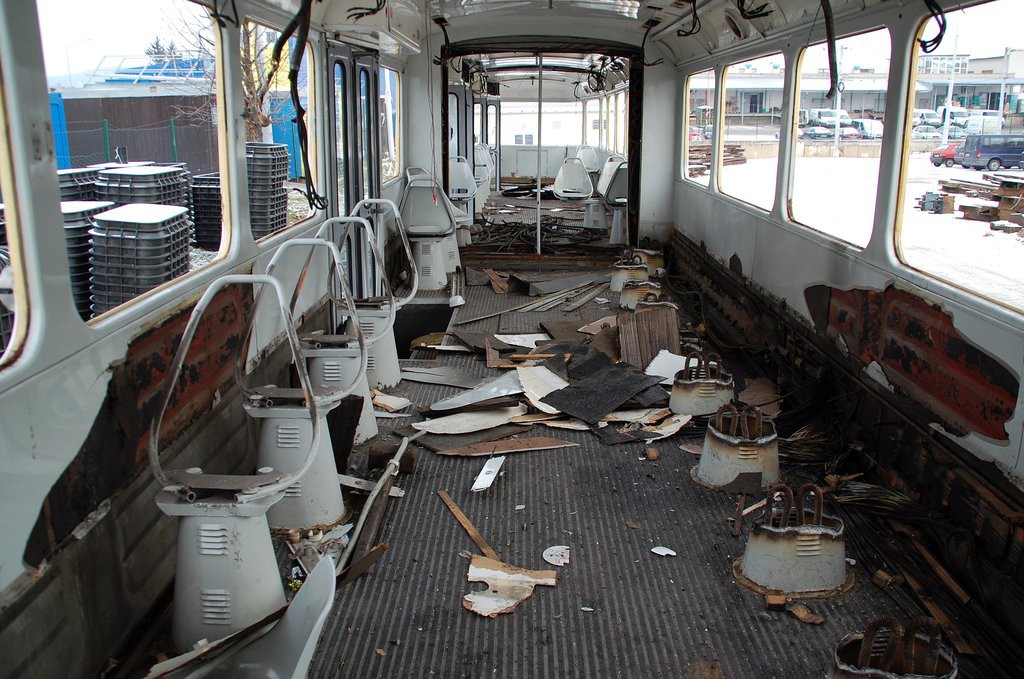 rozebraný interier tramvaje K2 1109 čekající na fyzickou likvidaci