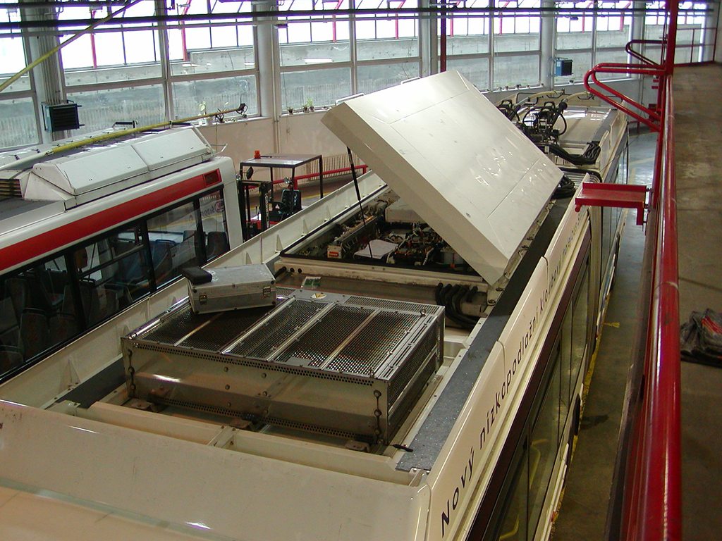 V popředí skříň s brzdovými odpory, za ní kontejner s trakční elektrovýzbrojí, v pozadí na druhém článku sběrače.