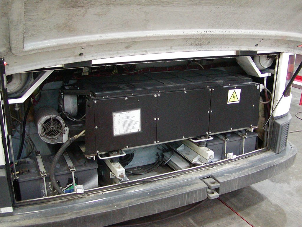 otevřená zadní schrána 21Tr - statický měnič 600 DC/380 AC Škoda, pod ním v rozích baterie, nad ním v rozích stahováky, vlevo od měniče jeho ventilátor