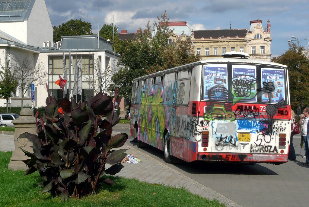 Vůz 7350 vystaven na Malinovského náměstí v rámci akce projektu Civitas jako Civitasbus - demonstrace působení vandalů na prostředky MHD