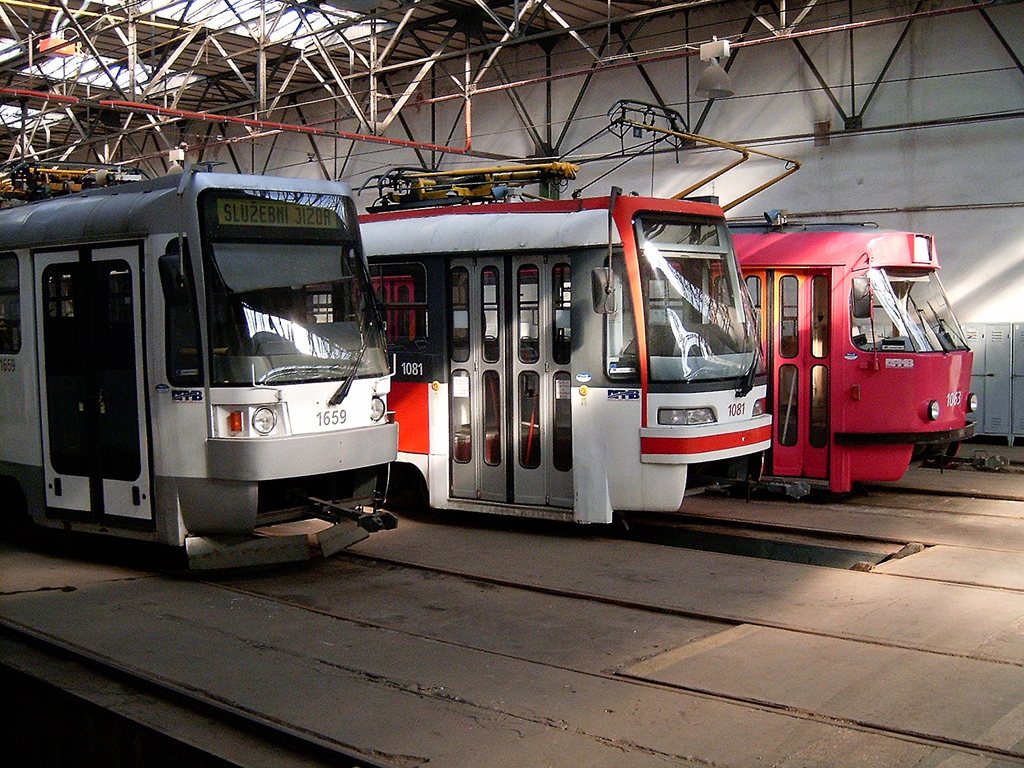 Fotografie ČKD DS T3R 1659 DPMB | ČKD Tatra K2R03 1081 DPMB | ČKD Tatra K2 1063 DPMB | Brno-Pisárky, vozovna Pisárky | Fotogalerie BMHD