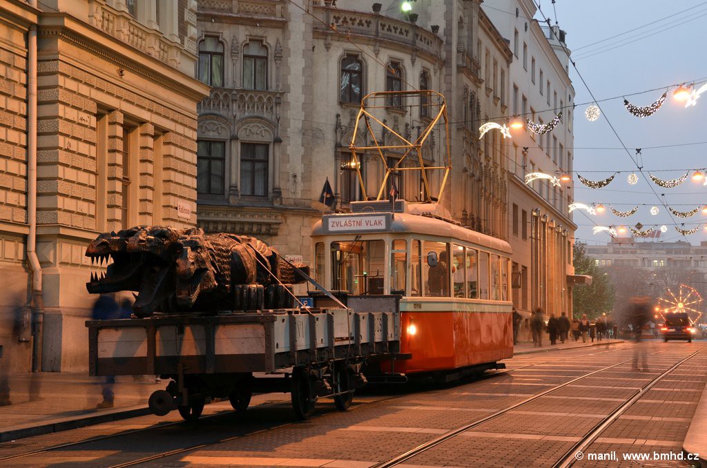 Zahájení Vánočních trhů 2011 na náměstí Svobody, ve kterém figurovala tramvaj 4MT, která před sebou tlačila nákladní vůz parní dráhy s tříhlavým drakem, který ze svých krvelačných tlam chrlil oheň
