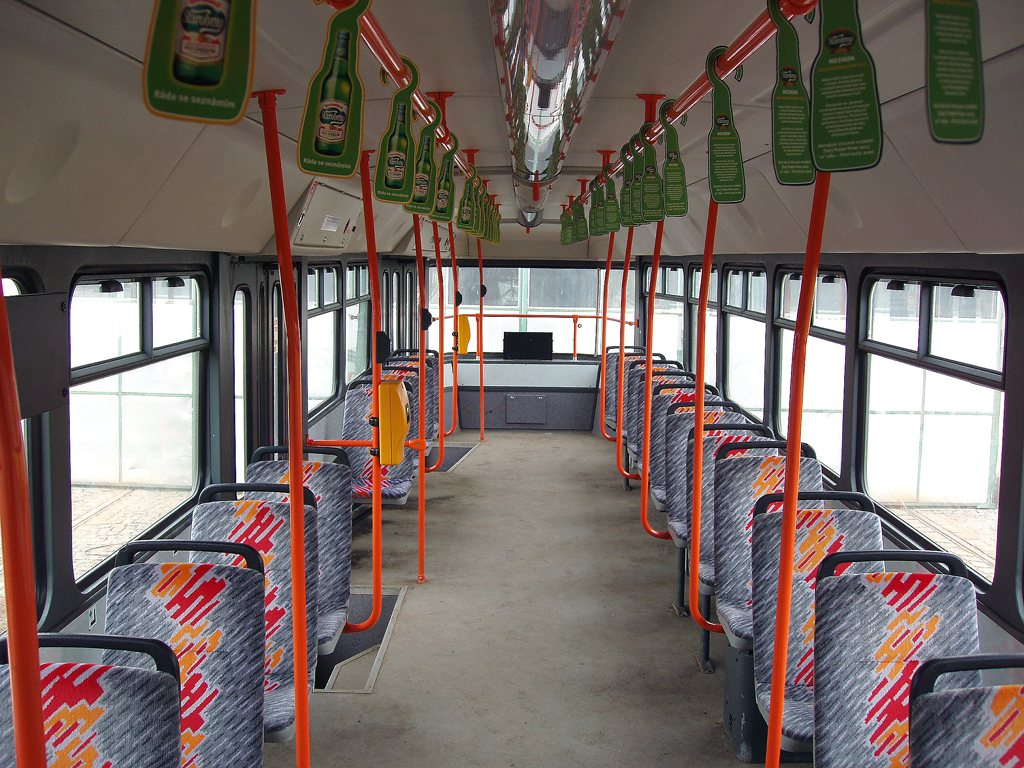 interiér vozu 1560. Fotka současně dokumentuje v únoru probíhající reklamní akci s pivem Starobrno